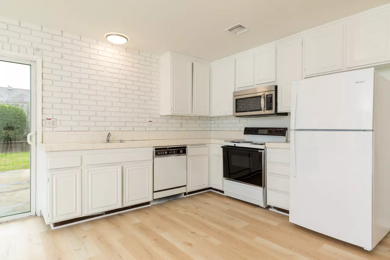 Before – Cabinets pre-paint, floor skim coat.After – White cabinets + LVP flooring modernize the space.