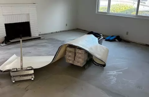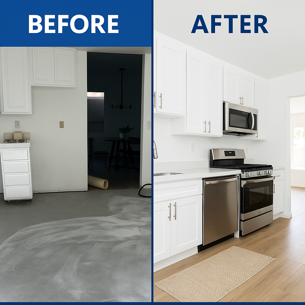 Before – Carpet removed, floor prepped.After – Fresh paint + new LVP brightens the space.